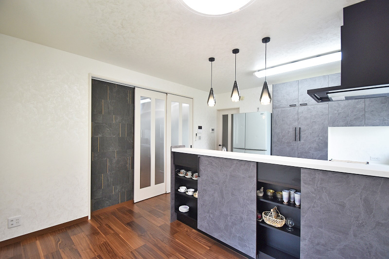 • 大竹市M様邸キッチンリフォーム後の施工事例写真。壁を撤去し、開放的なグレーの対面式キッチンに変更。3連ペンダントライトがおしゃれな空間。